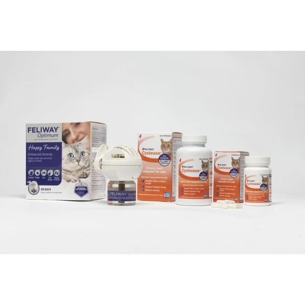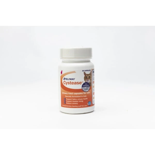 Feliway Cystease contains N-acetyl glucosamine and hyaluronic acid which help support the bladder lining and L-tryptophan is known to have a calming effect in cats.