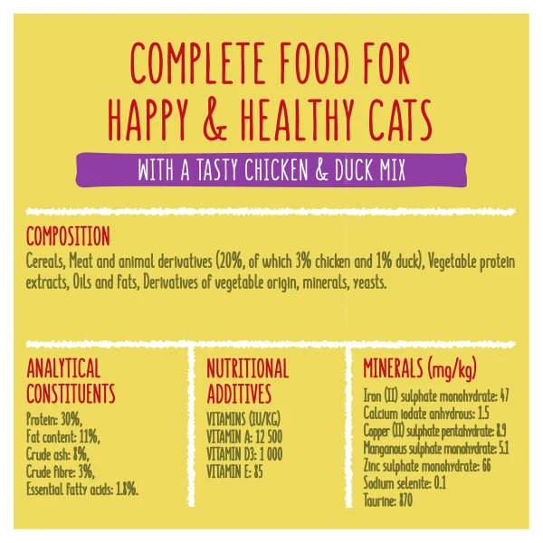 Cereals, Meat and Animal Derivatives (10%*), Vegetable Protein Extracts, Oils and Fats, Derivatives of Vegetable Origin, Minerals and Yeasts, *Equivalent to 20% Rehydrated Meat and Animal Derivatives, with a minimum 4% Chicken and 4% Duck.