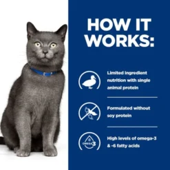 Hypoallergenic – helps reduce food intolerances and supports skin health. There can be a variety of reasons for a cat’s itchy skin condition, including sensitivities to food. The good news is, most pets with these skin conditions can benefit simply by eating the right food.Hill’s nutritionists & veterinarians developed Prescription Diet d/d dietetic pet food specially formulated to support cats with food sensitivities. In fact, d/d is clinically proven nutrition to help avoid adverse food reactions.