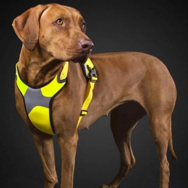 Sturdy, padded harness for dogs on the move. Easy to put on, comfortable to wear The adjustable collar and chest strap ensure a comfortable fit. Efficient 3M reflectors and bright high visibility dyes improve visibility in the dark. The back is equipped with a handle for better control of your dog in difficult places.