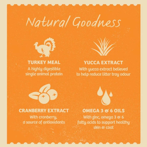 Turkey replaces other protein sources, but is just as tasty for your cat, while potato and cassava is used instead of grains. These are much easier for your pet to digest, and the food contains everything most cats need for a balanced healthy diet.