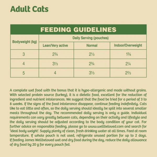 Some signs your cat has a food allergy could include vomiting, loose stools, frequent coughing or sneezing, and inflamed skin. Cats can be very good at hiding illness however, so, if you think something might be wrong, always consult your vet first. If it is a food allergy, James Wellbeloved adult cat turkey pouch can often be a healthy alternative. Make sure to use it over three to eight weeks to help reduce any signs of allergy in your cat. If the symptoms have disappeared after this period, you can then generally continue to feed your pet it indefinitely.