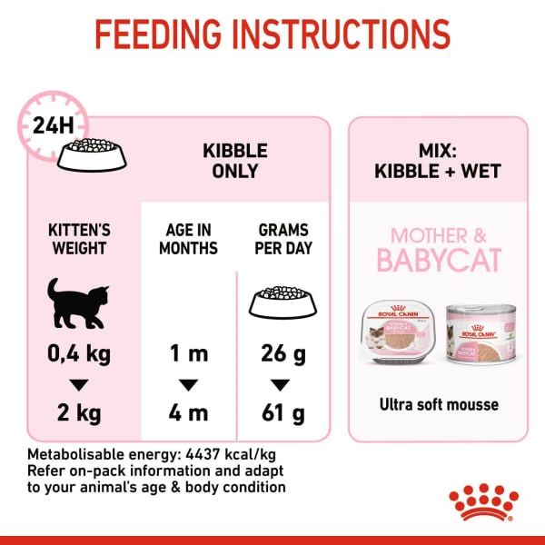 Royal Canin Mother & Babycat is specially adapted to meet your cat’s high energy needs at the end of gestation and during lactation. It’s also formulated to support the healthy development of nursing kittens up to 4 months old.