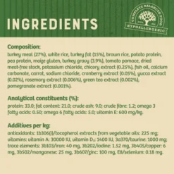 Pork by-products, poultry by-products, salmon, maize flour, pork blood products, corn starch mixture, minerals, maize gluten, vital wheat gluten, powdercellulose, sunflower oil refined, caramelised sugars.