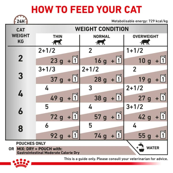 Because veterinary diets are formulated for the nutritional support of pets with specific clinical conditions, we recommend that you only use them under professional advice. For more information on feeding Royal Canin Veterinary Diet Feline Gastro Intestinal Moderate Calorie GIM 35 to your cat, please consult your veterinary surgeon.
