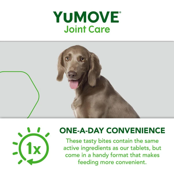 YuMove One-A-Day uses the same well-loved formula as our tablets, but comes in a handy, tasty bite that makes administration easy for your dog.