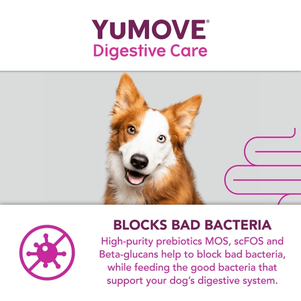 It’s the only supplement for dogs that combines probiotics and YuMOVE’s unique BioActiv™ complex – three different natural prebiotics. These science-backed ingredients top up good bacteria, block bad bacteria, and help dogs with sensitive digestion to have a good day, every day.