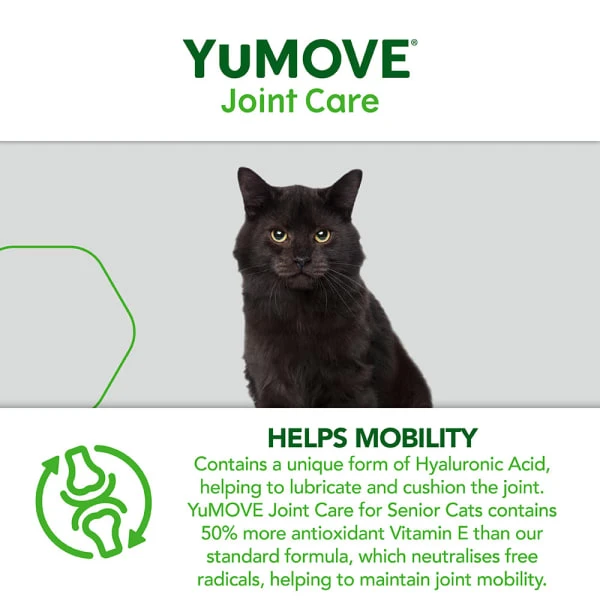 Recommended for older cats, or cats who require extra joint support, YuMOVE Joint Care for Senior Cats works to keep your cat active for life in three ways – soothing stiff joints, supporting joint structure and helping mobility.